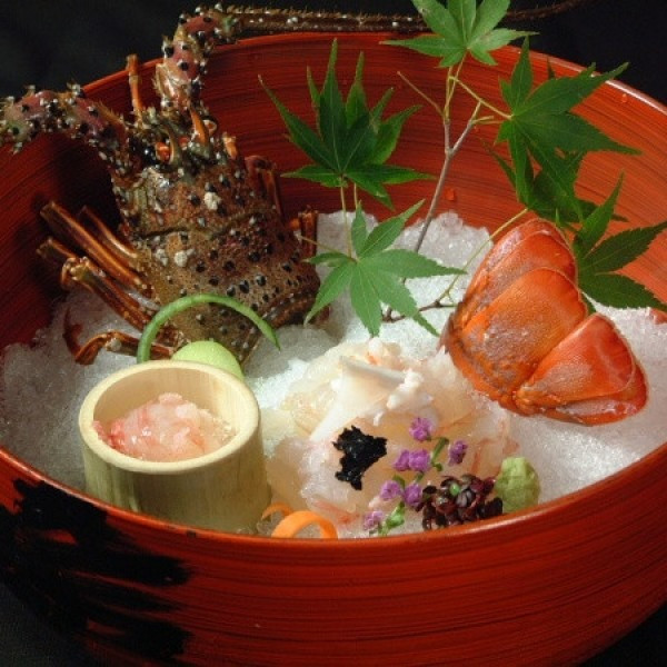 伊勢海老の活け造りなど、華やかな食材が満載の懐石。祝宴などにも最適。